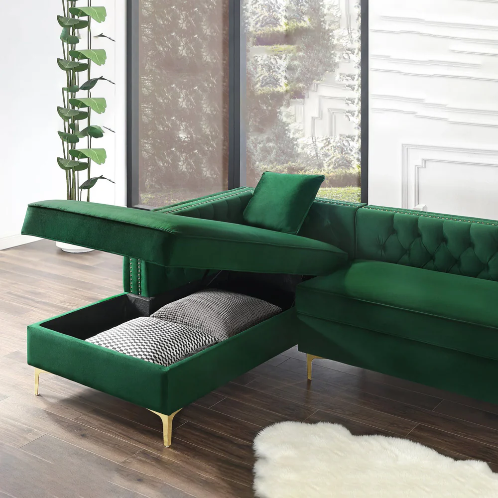 Our velvet left facing sectional sofa with chaise lounge will give your home the renaissance it deserves. Comfort and style is evident in this dynamic sofa. This sectional features rich hued button tufted velvet fabric with contrasting gold nailhead trim accenting clean square arms, high density foam padding, and sturdy Y-shaped coordinating gold metal legs. With this chaise sectional, traditional meets modern and the result is nothing short of spectacular.