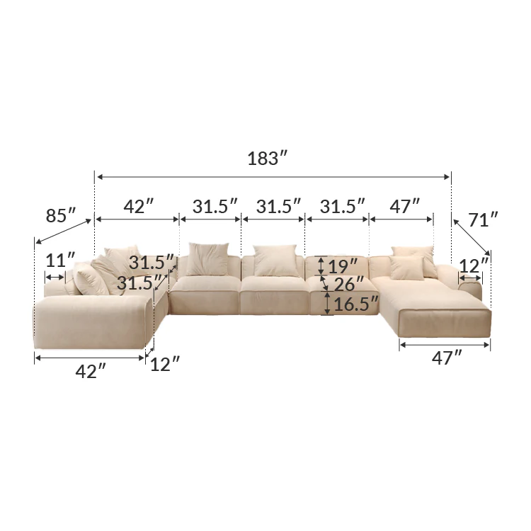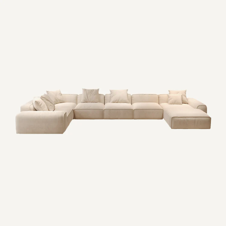 The modular sofa is thoughtfully designed with wide curved armrests that conform to the natural shape of the human body. This design promotes optimal relaxation and provides enhanced comfort during extended periods of seating.